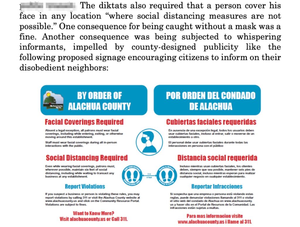 It’s only January, but I will already award the label “staunch conservative” the prize for understatement of the year. Even though Judge Tanenbaum recently ruled against me in a local elections case, I will never forget the very first time he ruled in my favor: my successful mask case. Here’s my favorite paragraph from his order, where Judge Tanenbaum described Alachua County’s mask ordinances as “diktaks”: